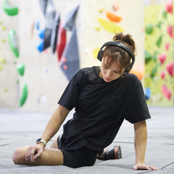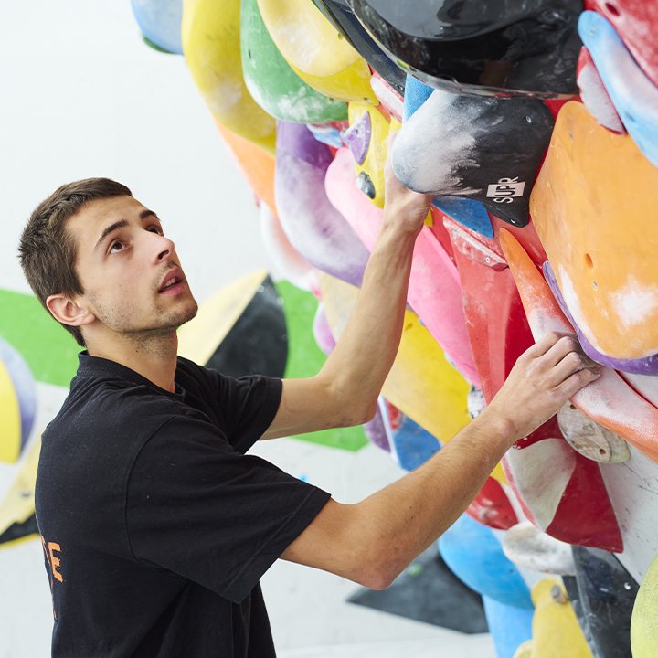 Description : Une collaboratrice s’agrippe à une prise sur le mur, mettant en évidence sa concentration et son engagement.
